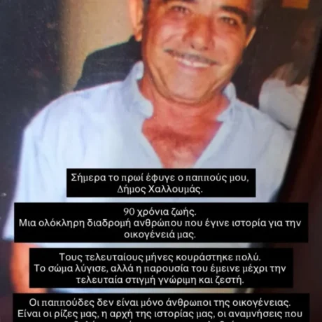 «Σήμερα το πρωί έφυγε ο παππούς μου, Δήμος Χαλλούμας. 90 χρόνια ζωής. Μια ολόκληρη διαδρομή ανθρώπου που έγινε ιστορία για την οικογένειά μας. Τους τελευταίους μήνες κουράστηκε πολύ. Το σώμα λύγισε, αλλά η παρουσία έμεινε μέχρι την τελευταία στιγμή γνώριμη και ζεστή.