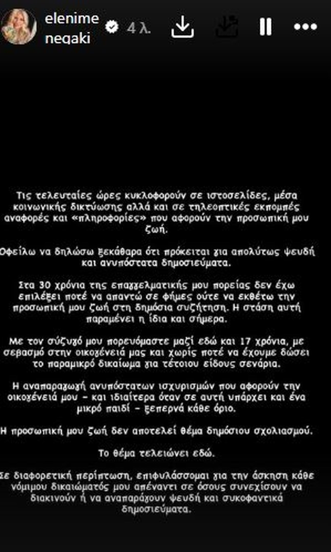 Η Ελένη Μενεγάκη τονίζει μεταξύ άλλων στην ανάρτησή της σε story του instagram, ότι “οφείλω να δηλώσω ξεκάθαρα ότι πρόκειται για απολύτως ψευδή και ανυπόστατα δημοσιεύματα”.