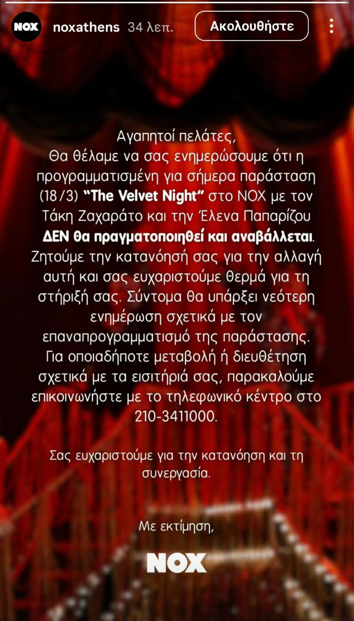 Στην επίσημη ανακοίνωση του ΝΟΧ αναφέρεται: «Αγαπητοί πελάτες, θα θέλαμε να σας ενημερώσουμε ότι η προγραμματισμένη για σήμερα παράσταση (18/3) “The Velvet Night” στο ΝΟΧ με τον Τάκη Ζαχαράτο και την Έλενα Παπαρίζου ΔΕΝ θα πραγματοποιηθεί και αναβάλλεται. Ζητούμε την κατανόησή σας για την αλλαγή αυτή και σας ευχαριστούμε θερμά για τη στήριξή σας».