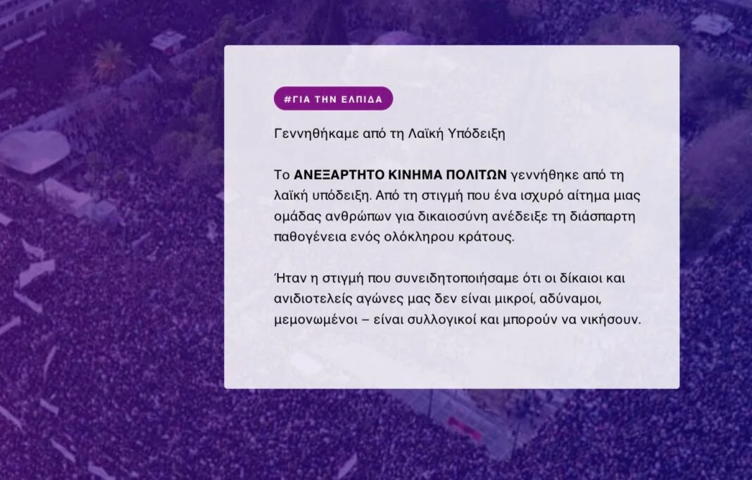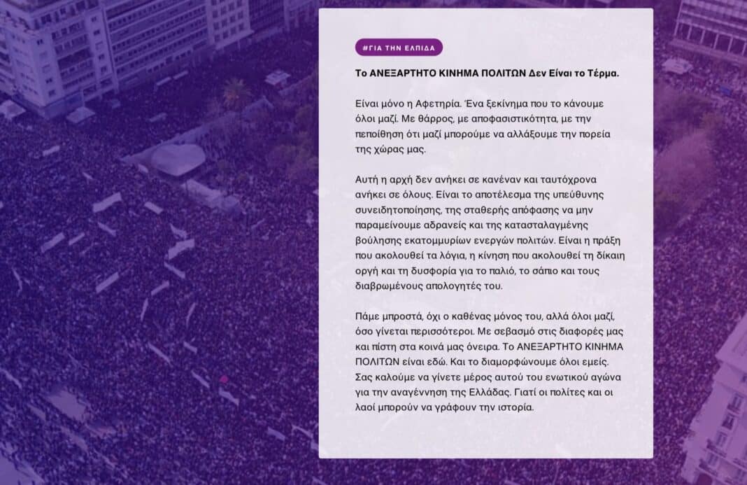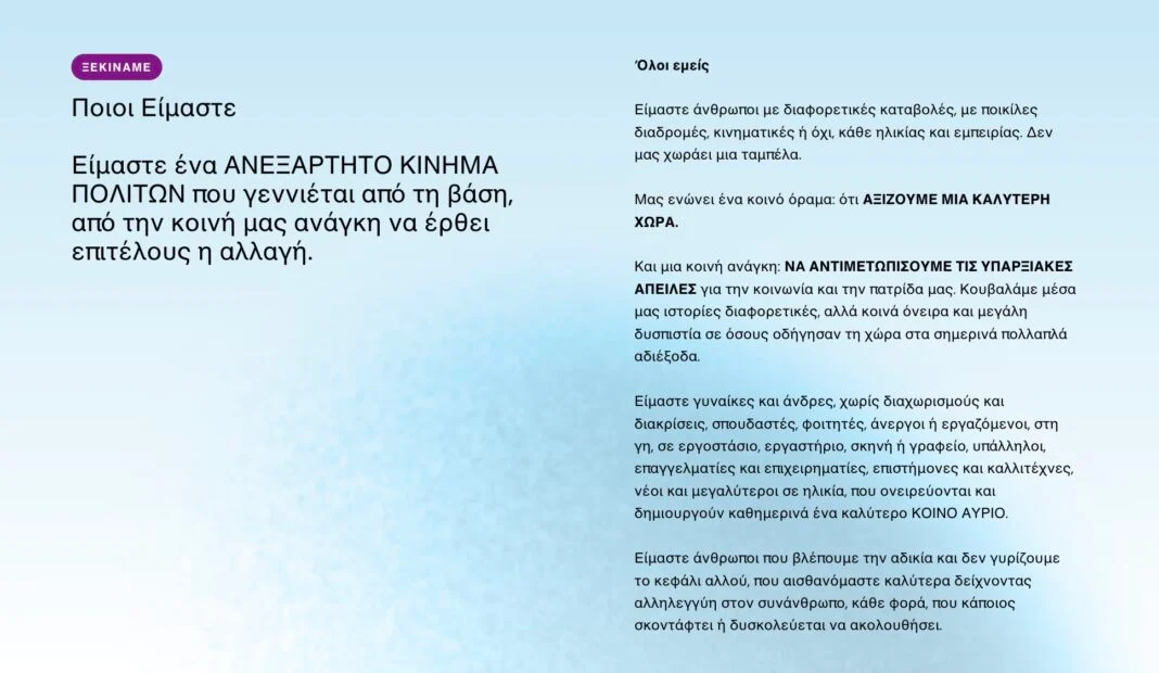 «Είμαστε ένα ΑΝΕΞΑΡΤΗΤΟ ΚΙΝΗΜΑ ΠΟΛΙΤΩΝ που γεννιέται από τη βάση, από την κοινή μας ανάγκη να έρθει επιτέλους η αλλαγή. Όλοι εμείς Είμαστε άνθρωποι με διαφορετικές καταβολές, με ποικίλες διαδρομές, κινηματικές ή όχι, κάθε ηλικίας και εμπειρίας. Δεν μας χωράει μια ταμπέλα. Μας ενώνει ένα κοινό όραμα: ότι ΑΞΙΖΟΥΜΕ ΜΙΑ ΚΑΛΥΤΕΡΗ ΧΩΡΑ. Και μια κοινή ανάγκη: ΝA ΑΝΤΙΜΕΤΩΠΙΣΟΥΜΕ ΤΙΣ ΥΠΑΡΞΙΑΚΕΣ ΑΠΕΙΛΕΣ για την κοινωνία και την πατρίδα μας. Κουβαλάμε μέσα μας ιστορίες διαφορετικές, αλλά κοινά όνειρα και μεγάλη δυσπιστία σε όσους οδήγησαν τη χώρα στα σημερινά πολλαπλά αδιέξοδα. Είμαστε γυναίκες και άνδρες, χωρίς διαχωρισμούς και διακρίσεις, σπουδαστές, φοιτητές, άνεργοι ή εργαζόμενοι, στη γη, σε εργοστάσιο, εργαστήριο, σκηνή ή γραφείο, υπάλληλοι, επαγγελματίες και επιχειρηματίες, επιστήμονες και καλλιτέχνες, νέοι και μεγαλύτεροι σε ηλικία, που ονειρεύονται και δημιουργούν καθημερινά ένα καλύτερο ΚΟΙΝΟ ΑΥΡΙΟ. Είμαστε άνθρωποι που βλέπουμε την αδικία και δεν γυρίζουμε το κεφάλι αλλού, που αισθανόμαστε καλύτερα δείχνοντας αλληλεγγύη στον συνάνθρωπο, κάθε φορά, που κάποιος σκοντάφτει ή δυσκολεύεται να ακολουθήσει».